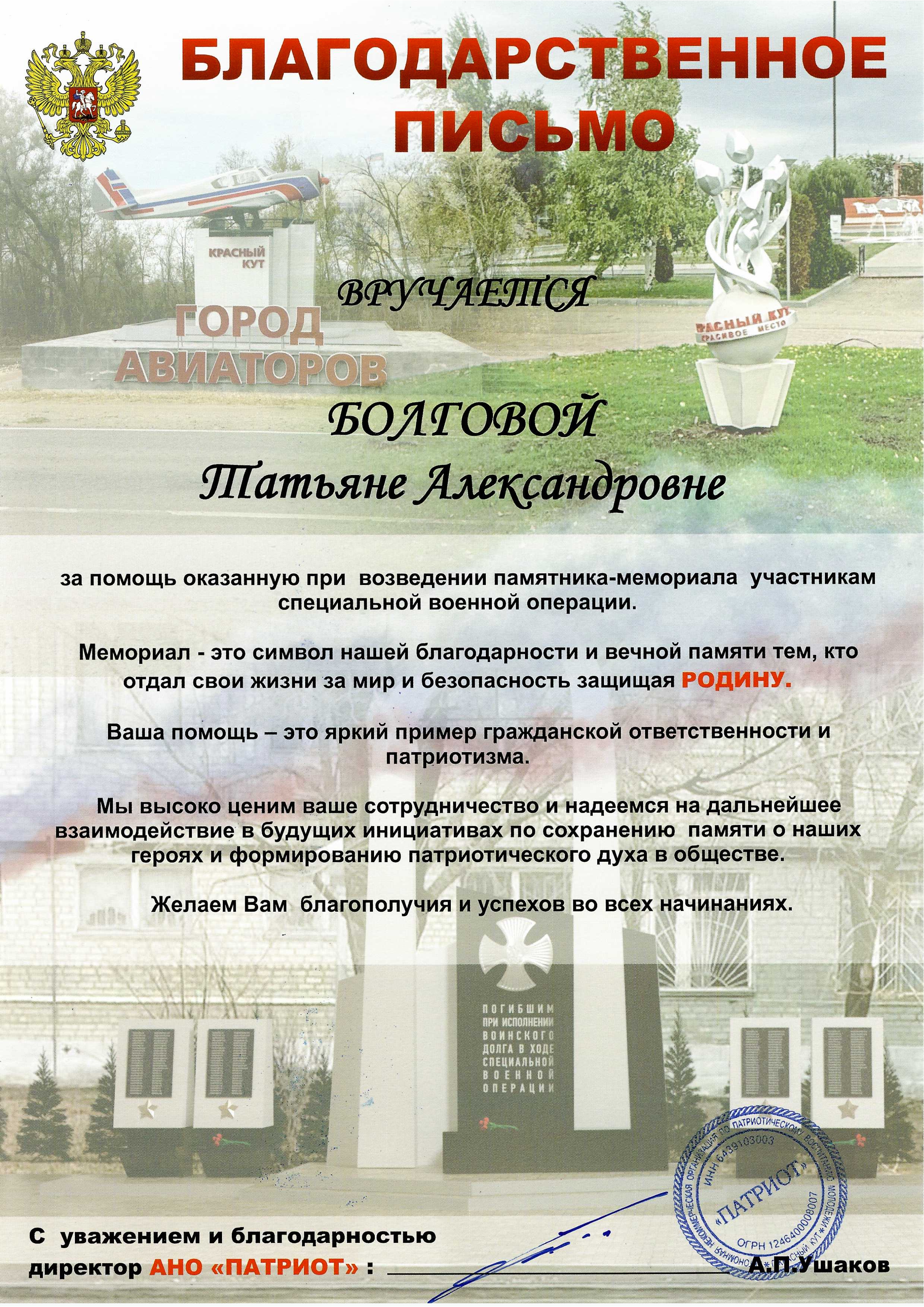 Нотариус г. Красного Кута и Краснокутского района Татьяна Болгова приняла участие в мероприятии. Вместе с неравнодушными жителями она оказала помощь в возведении памятника. Помощь Татьяны Болговой была отмечена благодарственным письмом АНО «Патриот».
